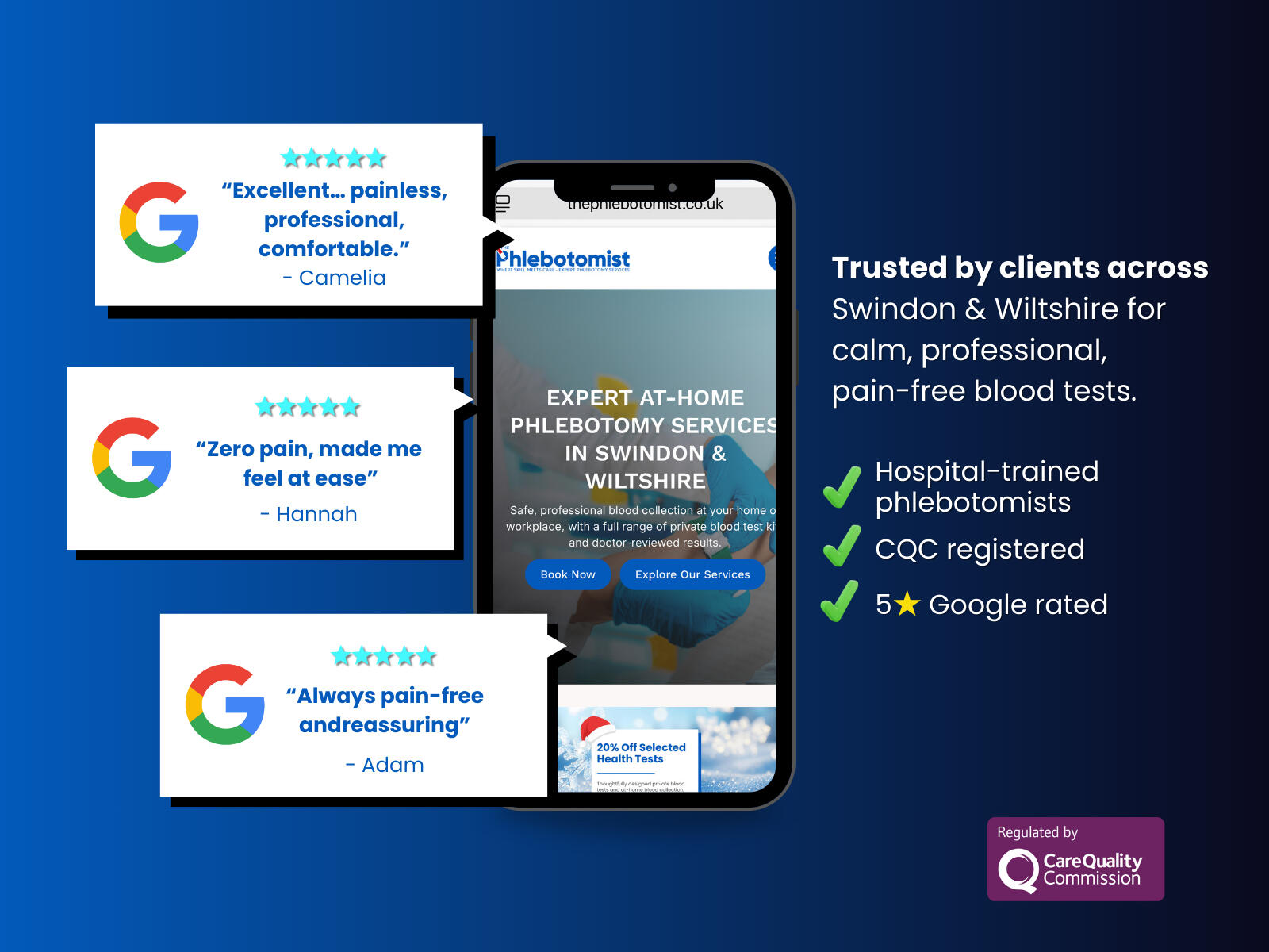 Welcome to The Phlebotomist, a trusted, CQC-registered private phlebotomy service based in Swindon. We make it simple to access safe, professional blood testing — whether you’re using your own private test kit, have an NHS blood form, or choose one of our own complete test packages.Every appointment is carried out by a hospital-trained phlebotomist, with samples processed in UKAS-accredited UK laboratories. When you order one of our tests, your results are reviewed by a doctor who creates a bespoke medical report, delivered securely to your inbox within 4–5 working days.We support adults (18+) across Swindon and nearby areas, including clients with needle phobia, mobility challenges, or busy schedules. Whether you need routine monitoring or a stress-free one-off test, our team combines clinical expertise and genuine care to make the process simple and comfortable.While we currently focus on adult testing, we plan to extend our service to children in the future. You can sign up for updates to be the first to know when this becomes available.